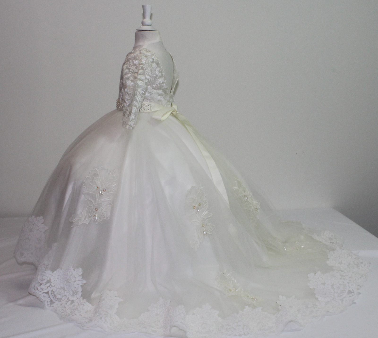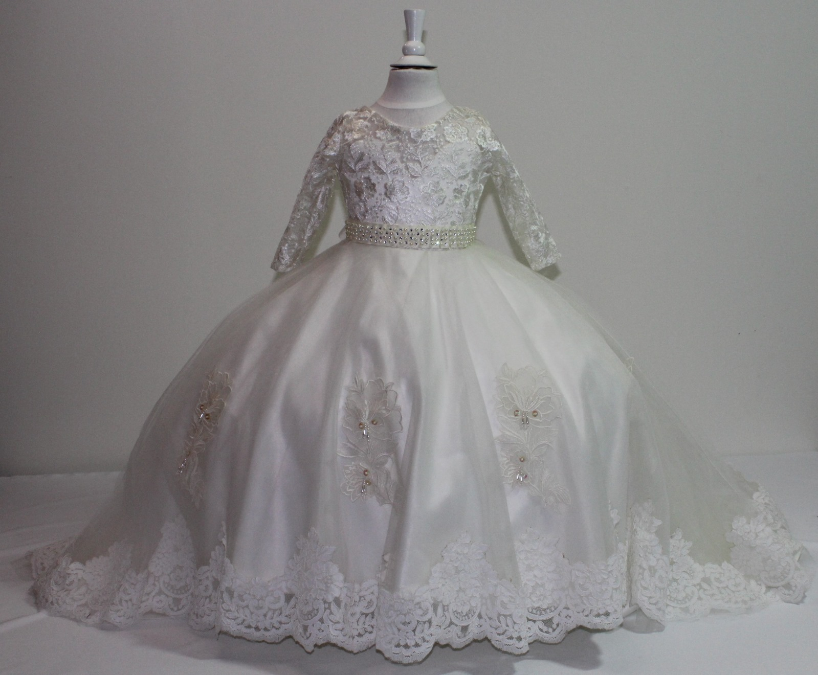 Confeccionado con tela de satin de seda en la parte de la blusa y tela de velo bordada con un escote corazón en la parte delantera y con un escote en cuello V en la parte trasera.La falda tiene 4 tules con aplicaciones en toda la falda y una cauda o cola bordada en la paté trácela con un cinturón bordado con perlas y piedreria.