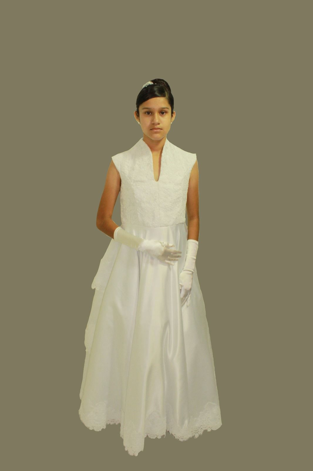 I am pleased to present our latest designs for First Communion dresses. Crafted from the finest materials, including silk satin, delicate veiling, intricate appliqués, and hand-embroidered swan-style embroidery, these dresses embody elegance and sophistication. The blouse features a swan neckline, complemented by a semicircular skirt that showcases a cascading back adorned with embroidered lace, adding a refined touch to the overall aesthetic. These designs are ideal for that momentous occasion.